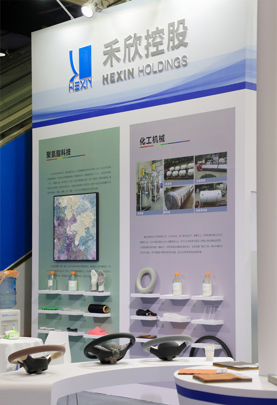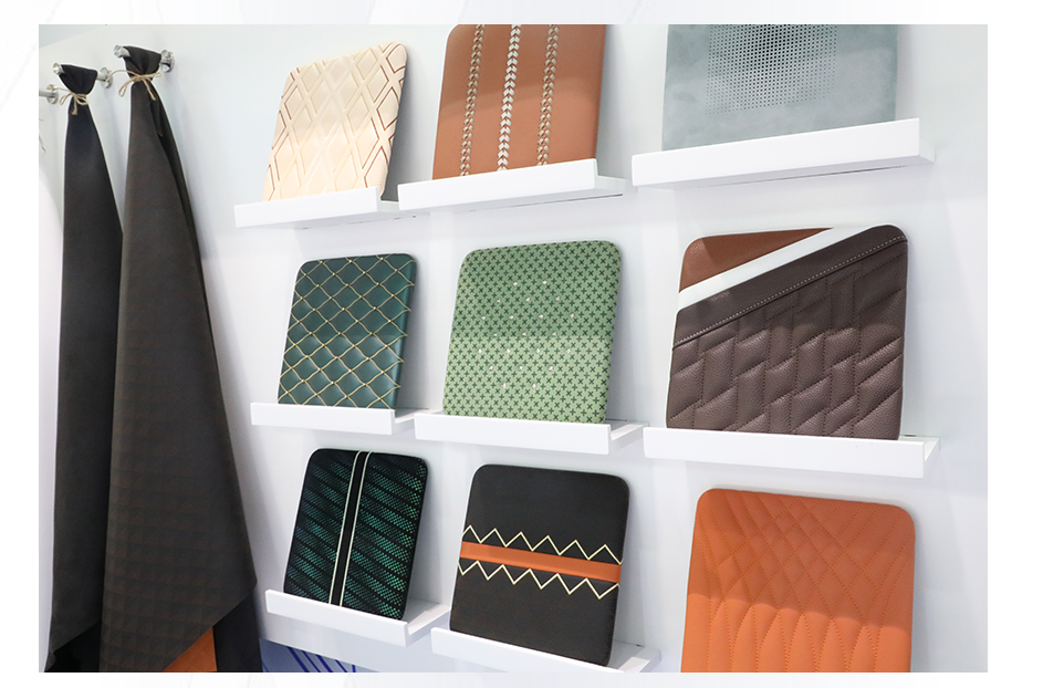 禾欣展臺B-T3位于會展中心中軸線,占據(jù)了展會C位。展臺以開放式布局體現(xiàn)開放、包容的展陳理念;藍、白主調(diào)輔以淺綠、淺灰、淺咖等淺色系,傳達出簡約、舒適的視覺效果。展板清晰展示了聚氨酯科技、化工機械、基布染整、絨面超纖、合成革、超纖皮等主營業(yè)務(wù),令參觀者一目了然。三幅皮革畫作既傳達了綠色環(huán)保理念,也為展會增添藝術(shù)氣息。展品除了豐富的皮革掛樣外,成品展示區(qū)還陳列了汽車內(nèi)飾、沙發(fā)、箱包、鞋靴、運動、電子包裝等的應(yīng)用場景。